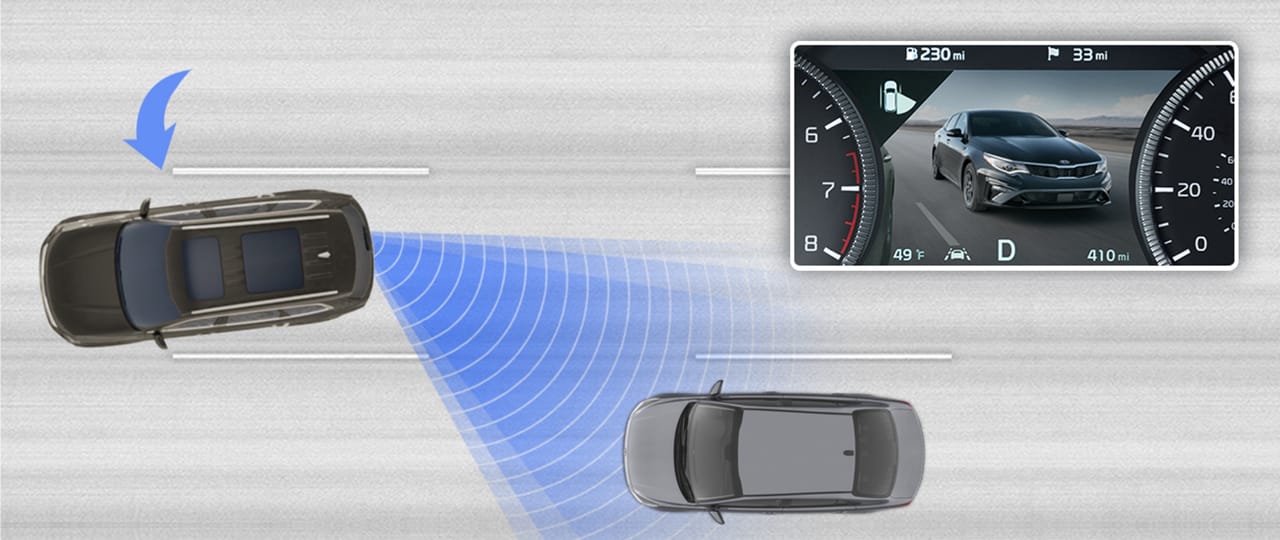 The available Blind-Spot View Monitor (BVM)1 display in your dashboard gauge cluster can display a live feed of your rear blind spots. Plus, if you try to change lanes while an object is detected in the blind spot, standard Blind Spot Collision Avoidance Assist-Rear (BCA-R)2 can help maintain your previous course.